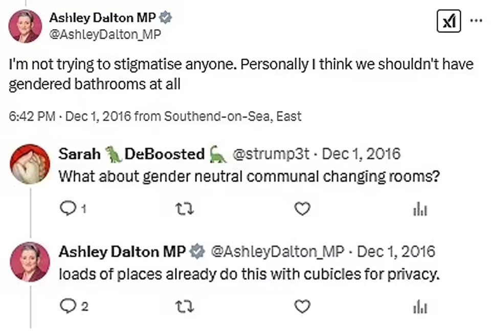 據英國傳媒透露,艾希莉曾於2016年在自己的Twitter上,表示:「變性女性不是男性。她們是女性。」又指:「我個人認為根本不應該有劃分性別的廁所和浴室,獨立的格間可提供私隱,很多地方已經這樣做了。」