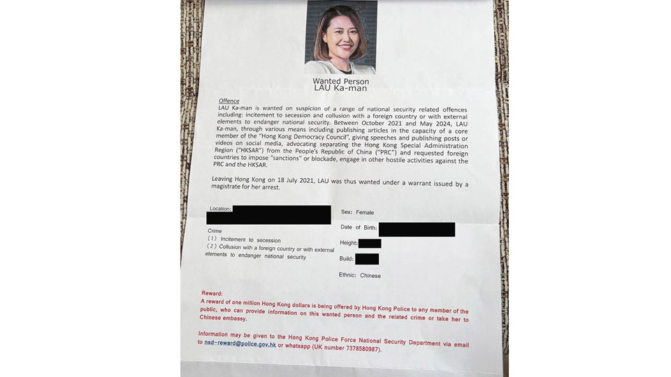 劉珈汶則稱,她長期在網上遭受騷擾和恐嚇,但如今連鄰居都收到懸賞信件,「這已是現實生活中的威脅,是實體的。」她還透露,她參加反對中國在倫敦塔附近興建「超級大使館」的抗議活動後,香港警方於兩日後約談了她的遠房親戚。