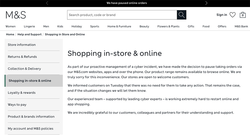 據《BBC》報道,網絡攻擊導致馬莎百貨的多項服務受阻,包括非接觸式支付、點擊自取(Click & Collect)服務,以及使用禮品卡及電子禮品卡付款的功能。該公司在X上回覆客戶查詢時表示:「目前店內及網上均無法使用禮品卡、電子禮品卡及信用收據作為付款方式。」不過,對於已收到取貨通知電郵的客戶,馬莎百貨確認仍可在店內領取包裹,並承諾所有包裹將保留至另行通知,不會退回。