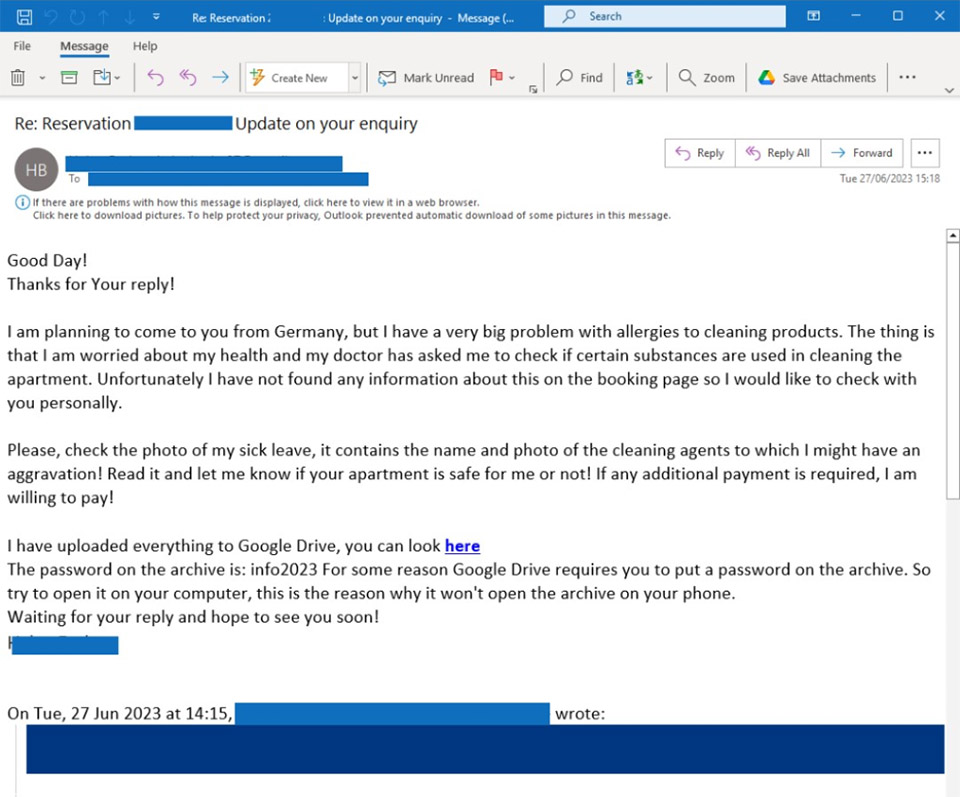 另一種詐騙手法則涉及假冒Booking.com網站。受害者會收到偽造的電郵鏈接,點擊後被要求「接受」網站Cookies,隨即下載惡意檔案至其電腦。