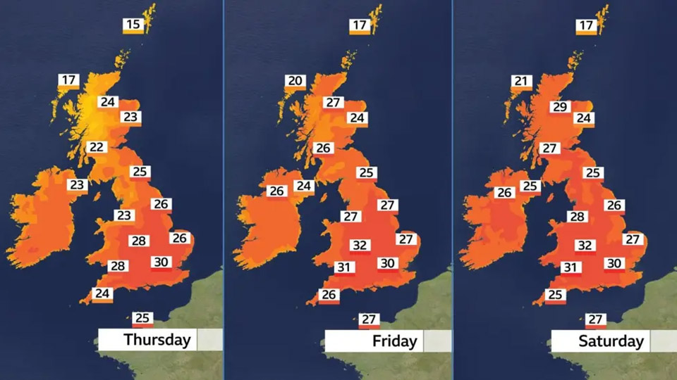 本週中期起,高壓系統將取代近日的涼爽西北氣流,帶來充足陽光。週三(7月9日),英格蘭及威爾斯大部分地區將現晴朗天氣,中部及東南部氣溫達25-28°C。週四至週五,熱浪範圍擴大至北愛爾蘭及蘇格蘭,北部蘇格蘭週六料達29°C,北愛爾蘭約26°C。英格蘭及威爾斯多地週末氣溫將突破30°C,熱點地區最高達33°C。