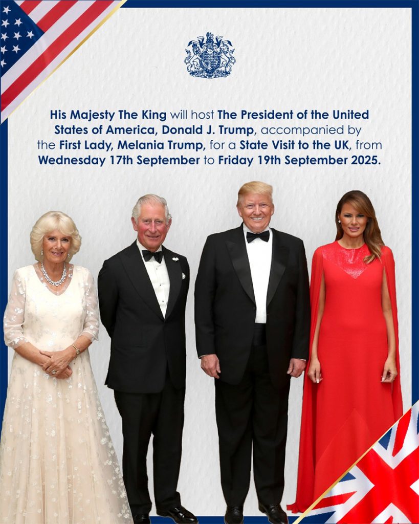 白金漢宮宣布,美國總統特朗普已正式接受國王查理斯三世邀請,將於9月17日至19日偕同第一夫人梅拉尼婭,進行其第二任期內首次國事訪問,並入住溫莎堡。此為特朗普繼2019年首任期內獲已故女王伊利沙伯二世接待後,第二次獲英國王室以國事訪問規格款待,打破慣常不為連任總統安排國事訪問的傳統。