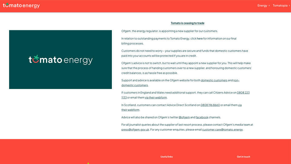 Ofgem(天然氣及暨市場電力市場管制局)總監羅漢·丘姆(Rohan Churm)表示:「Tomato Energy客戶無需擔心,供電不會中斷,家庭用戶餘額受保護,我們正迅速選定新供應商。」客戶暫勿轉換供應商,轉移後將受能源價格上限保障。