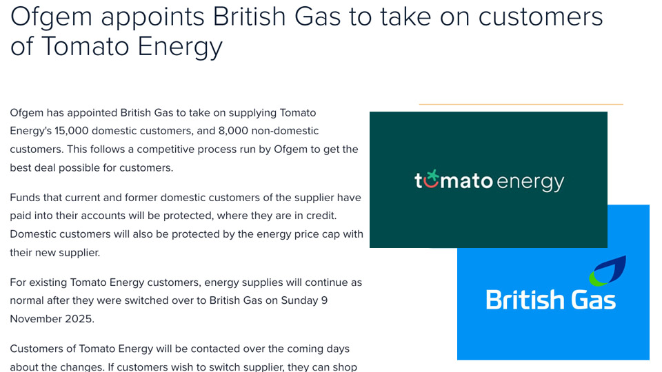 Tomato Energy上週因現金流問題正式停止營運,這是自2021年能源危機以來,第31間倒閉的英國能源供應商。Ofgem於11月9日(星期日)已將所有Tomato Energy客戶轉移至British Gas,供應如常。British Gas將於未來數天至數週內聯繫客戶,設立新賬戶並提供相關資訊。