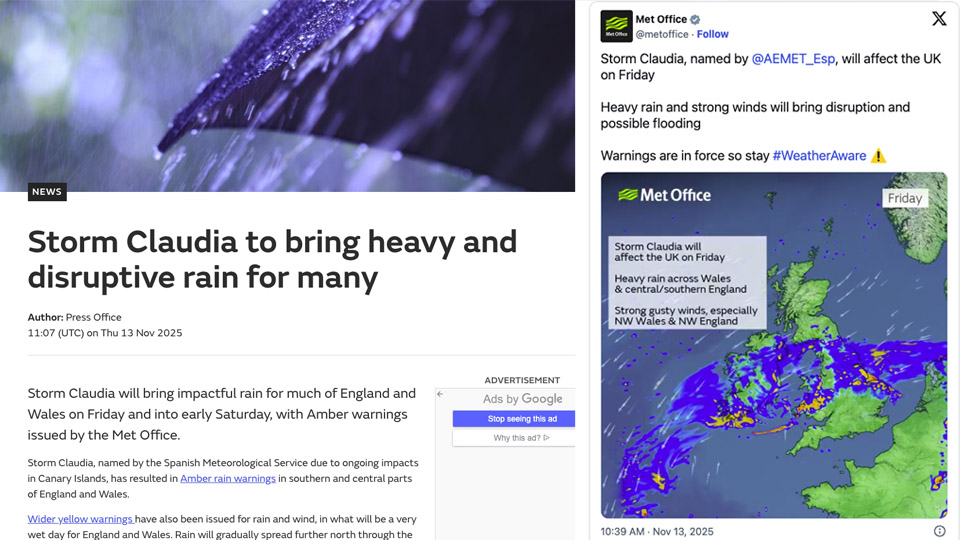 英國氣象局(Met Office)今晨發出琥珀級雨量警告,預測暴風克勞迪亞(Storm Claudia)於今日中午起帶來持續暴雨,導致英格蘭中南部及威爾斯大範圍洪水,部分地區24小時內雨量恐達一個月總和,洪水或成「生命威脅」。