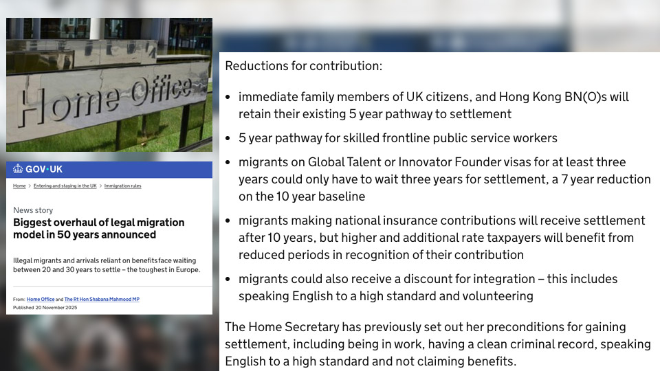 根據內政部最新數據,截至2025年9月,已有超過21.3萬港人經BN(O)簽證抵英,其中超過12萬人已獲批或即將符合現行5年定居資格。政府估計,若無豁免,新制將影響近200萬合法移民,但BN(O)港人完全不受波及。