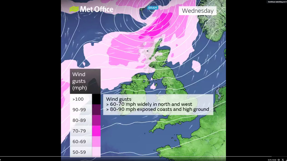英國正面臨風暴布拉姆(Storm Bram)侵襲,帶來強勁風力及暴雨,導致多個地區交通中斷、電力供應故障及洪水風險上升。英國氣象局(Met Office)表示,此風暴為本季第四個命名風暴,將於週二至週三影響北部及西部地區。