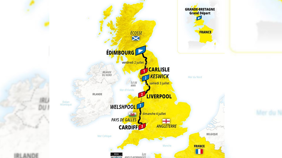 據英國廣播公司(BBC Sport)及《衛報》報道,男子環法單車賽將於2027年7月2日(星期五)在愛丁堡城堡(Edinburgh Castle)前舉行盛大開幕儀式,首階段途經蘇格蘭邊區,全程184公里,終點為英格蘭卡萊爾(Carlisle)。第二階段由凱西克(Keswick)出發,穿越湖區(Lake District),終點利物浦(Liverpool),距離223公里。第三階段從威爾斯威爾斯浦(Welshpool)起步,途經威爾斯山谷多達八個爬坡,最終於卡迪夫(Cardiff)結束,距離同樣223公里。這是環法單車賽首次在蘇格蘭及威爾斯舉行Grand Départ階段,路線橫跨蘇格蘭、英格蘭及威爾斯三地,展現英國地形的多樣美麗。