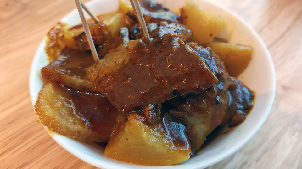 我點解話佢哋夠用心,係因為佢哋好多材料都係自己花時間去整,而唔係就咁買現成。例如最簡單嘅咖哩豬皮,一般做法通常係買一塊塊已經炸好嘅豬皮返嚟浸,但Food Stops就竟然係買生豬皮返嚟,先起走晒啲脂肪之後再攞去風乾,然後再去炸。筆者試過,又真係比一般用現成燒豬皮整出嚟嘅口感較為綿密。除此之外,佢哋近排仲有自家製嘅新鮮豬油同潮式辣椒油賣,雖然唔係咩好複雜嘅嘢,但可見佢哋真係好俾心機做好出品。