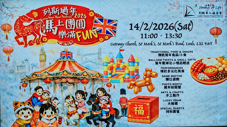 過兩日就係農曆新年,繼上星期喺Kirkgate Market舉行嘅香港人年宵後,今個星期就輪到啱啱喺昨日順利舉行嘅教會新年慶典「馬上團圓・樂滿FUN」。一如去年,今年嘅教會新年慶典同樣係充滿熱鬧氣氛,表演、攤位遊戲、購物、小食同抽獎,加上昨日適逢係情人節,大會場內仲專登整咗個Photo Booth俾大家影相。不如等我哋帶大家回顧一下今年嘅熱鬧盛況。