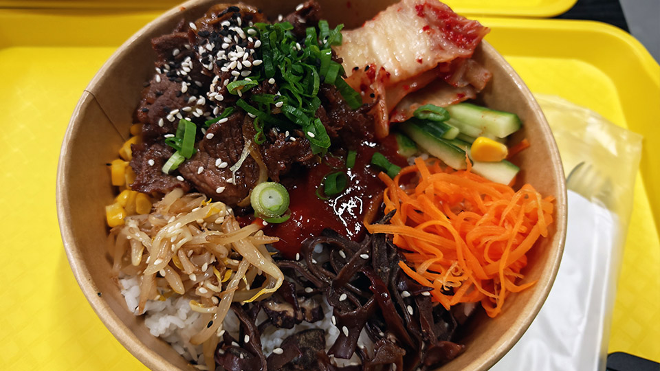 我成日覺得Morley Market好似個迷宮,而今次要介紹嘅Ha Ha小店,其實喺13 Noodles嘅另一邊。去到,發現佢哋租咗兩個鋪位,一個係廚房以及細細嘅雜貨店,主要賣香港人食開嘅嘢,而另一個就主要俾人座。去到當日係中午時份,客人一啲都唔少。其中一枱有位女士仲同我哋講,佢哋住喺Wakefield,但經常揸車過嚟食。佢嘅推介係韓式伴飯,咁我哋當然要試吓。