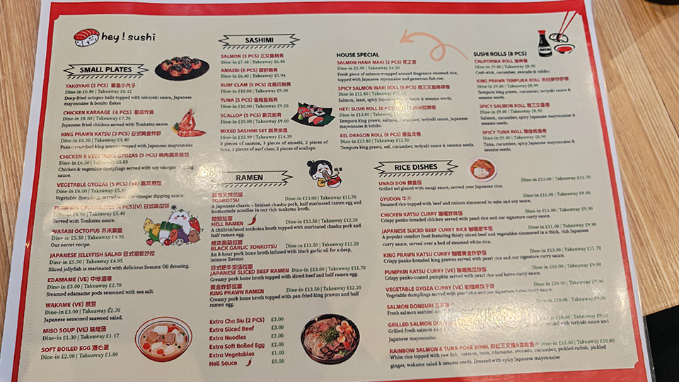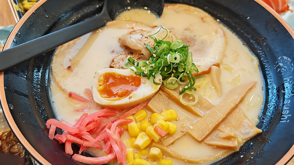 除咗壽司之外,hey! sushi 仲有好多熱食值得推介。第一樣係拉麵,因為筆者食慣濃味,所以我點咗熊本黑蒜拉麵,比原味豚肉湯底多咗一份醇厚嘅焦香味,昇華咗一個層次;第二樣要推介嘅係溏心蛋!可能大家覺得溏心蛋冇咩特別,自己都整到,但其實整溏心蛋嘅損耗率係十分之高,特別係餐廳,冇理由整隻爛咗嘅俾你,呢度一隻溏心蛋只係賣唔使£2,老實講,良心價。
