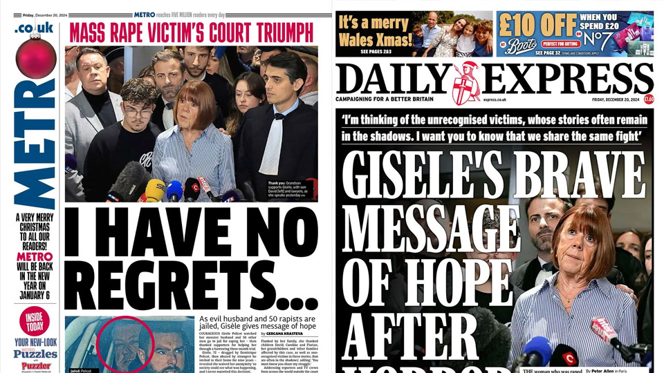 調查發現,於2011年至2020年間,Gisele曾遭72名來自不同的年齡、種族和社會階層的陌生人性侵。雖然部份男子聲稱不知道Gisele是在被迷昏的狀態下與他們發生性關係,但法官並不接納他們的解釋。昨日,法庭裁定Dominique罪成,被判入獄二十年,其餘五十名被告則被判三至十五年不等。