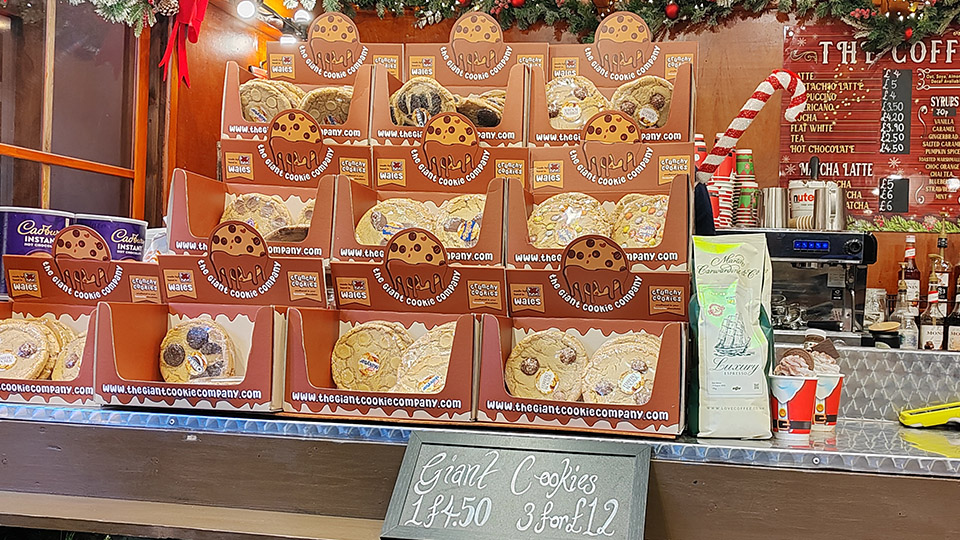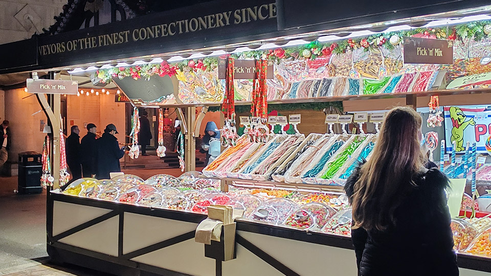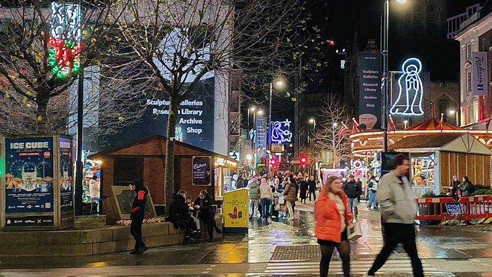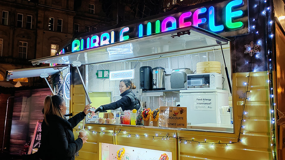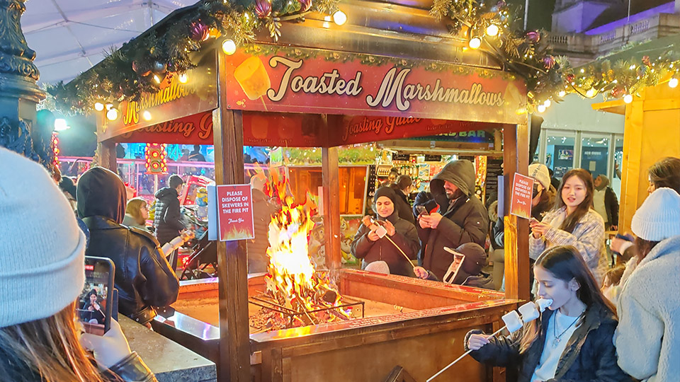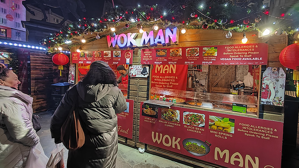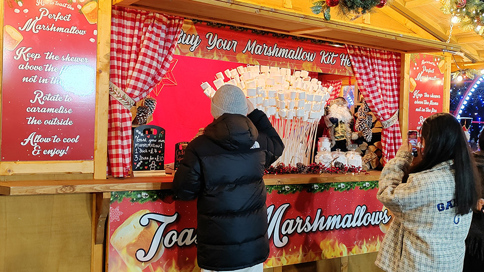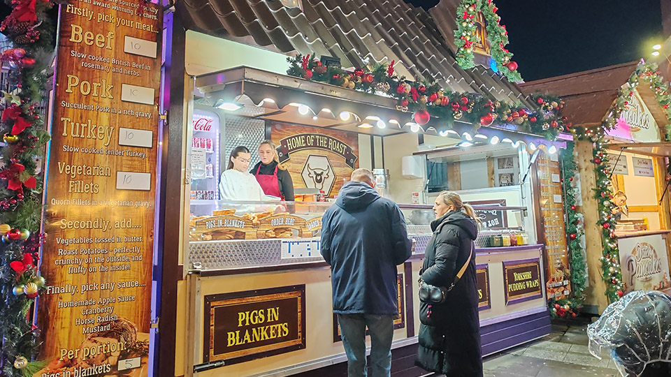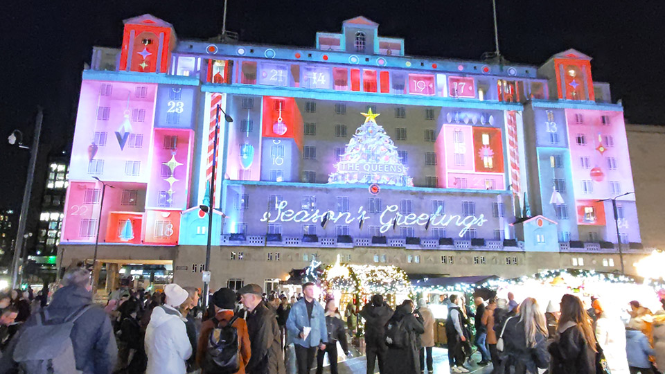 去到City Square,最吸引當然係投射喺Queens Hotel上面既大型聖誕燈畫。燈畫旁邊就係食檔同賣嘢檔,例如有賣傳統聖誕熱紅酒(mulled wine),好靚但甜到爆的土耳其糖,以至手工藝品等等。至於食方面,當然漢堡熱狗薯條沙威瑪等等一定有,比較特別係有一檔類似港式雙餸飯,都係煮定一大盆筆吓筆吓咁,但一樣餸加一個飯或炒麵底的Mead Deal要£9定£10,所以冇試到。另外亦有珍珠奶茶同雞旦仔檔。