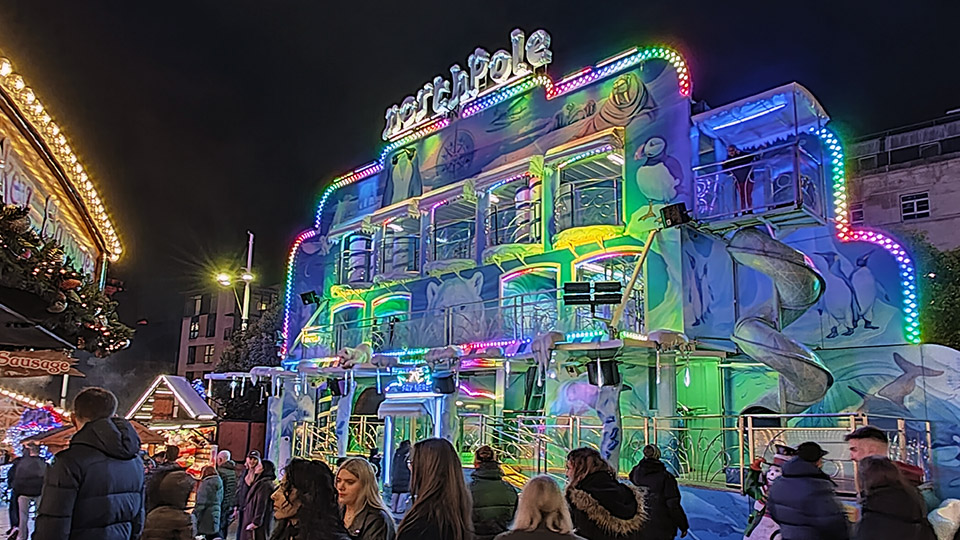 行完City Square後,可以繼續行去千禧廣場,步行距離大約十分鐘。千禧廣場主要係遊戲區,大量機動遊戲例如旋轉木馬、咖啡杯、小型跳樓機等等。但最吸引同比較少見既,第一個係The North Pole;簡單地講,The North Pole係一條三層樓高的滑梯,玩家由地下一路行上三樓,途中既行人通道會有啲機關,會郁或者會轉等等,中間亦都有啲任務要你做。當然,呢個遊戲係俾小朋友玩,但其實由三樓望返落黎,飽覽整個聖誕巿集都幾靚。(每位每次£4)